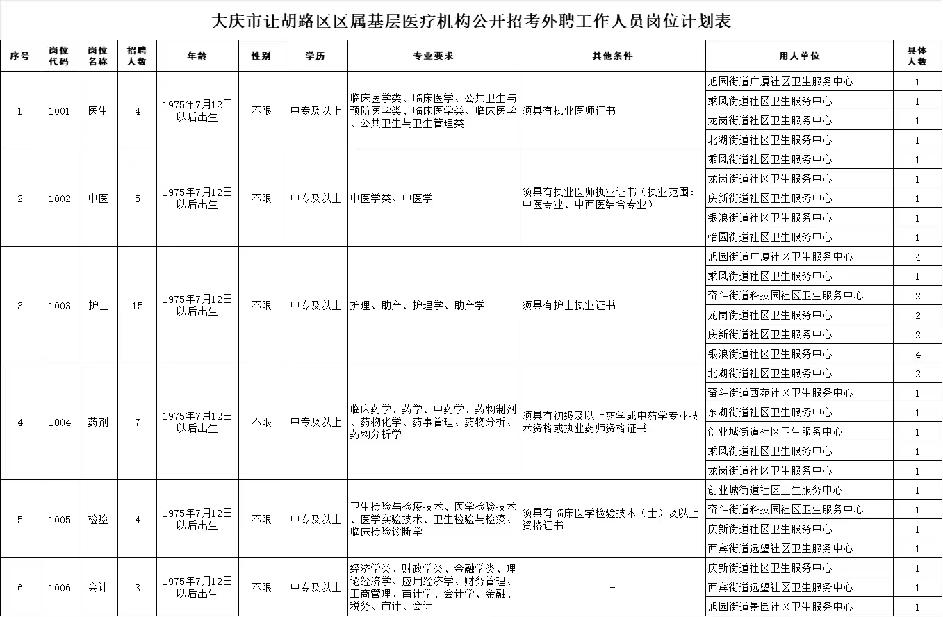 (四)具有符合招聘崗位要求的學歷、專業、年齡等條件,詳見《大慶市讓胡路區區屬基層醫療機構公開招考外聘工作人員崗位計劃表》(附件1);